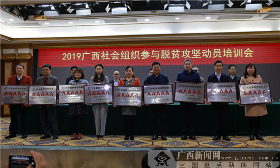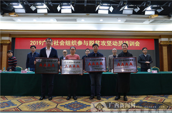 广西新闻网南宁3月16日讯 (记者 刘家财 通讯员 贾经纬)记者从在3月15日召开的2019年全区性社会组织年检、评估暨参与脱贫攻坚工作培训班上了解到,本月,自治区民政厅发出了《关于动员和鼓励社会组织参与打赢脱贫攻坚战三年行动的通知》(以下简称《通知》),号召全区各级各类社会组织全力投入脱贫攻坚战三年行动。培训班上,自治区民政厅还为2018年度评估为3A以上等级的14个社会组织予以授牌并颁发证书。