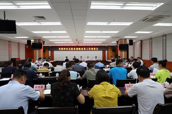 6月13日上午,在西林县句町文化艺术中心二楼会议室召开的巩固西林县脱贫摘帽成果工作座谈会。自治区民政厅党组书记、厅长朱学庆同志、广西科学院党组书记黄岑汉同志、右江民族医学院党委常委、副校长、组织部部长李雪斌同志,中国能源建设集团广西电力设计研究院有限公司纪委书记、工会主席、监事杨记生同志、百色市人民政府市长助理楼奎良同志出席了会议并讲话。会议由自治区民政厅副巡视员苏耀南同志主持。会上西林县委书记冉光富同志作了全县脱贫摘帽工作情况汇报。四个区直(中直)帮扶单位各指定了一名驻村第一书记代表分别作了发言。