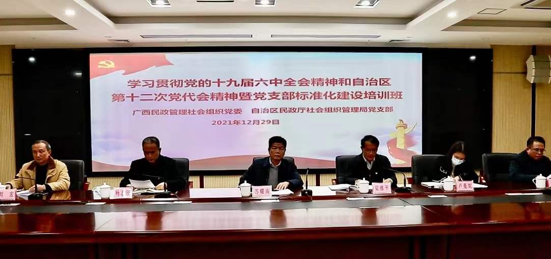 12月29日,广西民政管理社会组织党委在南宁举办党的十九届六中全会精神和自治区第十二次党代会精神宣讲会暨社会组织党支部标准化建设培训班。自治区民政厅二级巡视员、民政管理社会组织党委书记苏耀南出席开班仪式并进行宣讲。