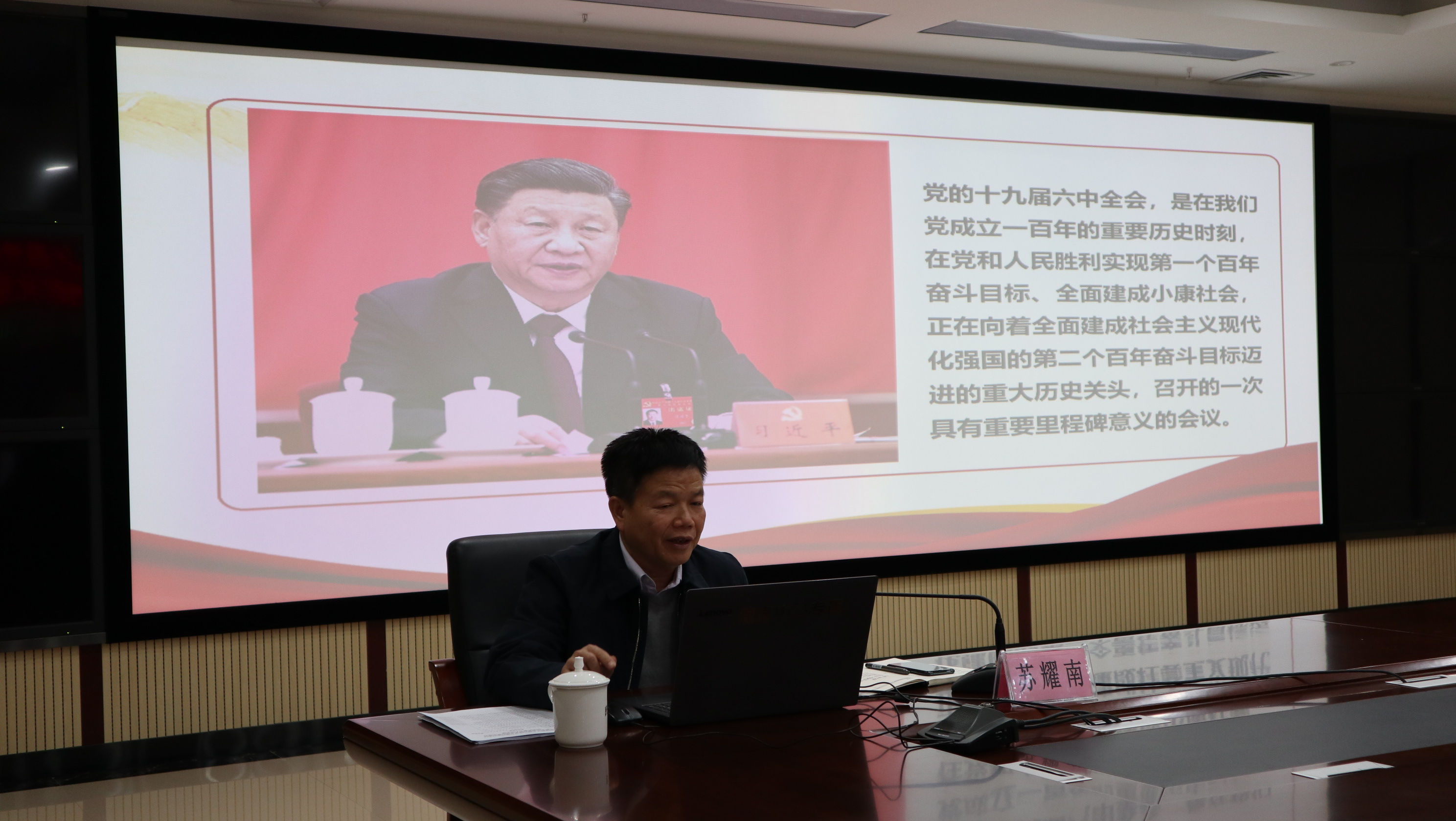 苏耀南围绕“会议的基本情况”“四个历史时期和四个历史飞跃”“马克思主义中国化的三次飞跃”“深刻认识总结党的百年奋斗重大成就和历史经验的重大意义”“两个确立”“深刻认识中国特色社会主义新时代的历史性成就和历史性变革”“牢记一个根本问题”“一个号召”等方面,系统讲解了党的十九届六中全会召开的重大意义和深远影响,全面阐述了全会取得的重大成果、作出的重大部署,并对自治区第十二次党代会精神以及自治区党委书记刘宁所作的报告进行了阐释。