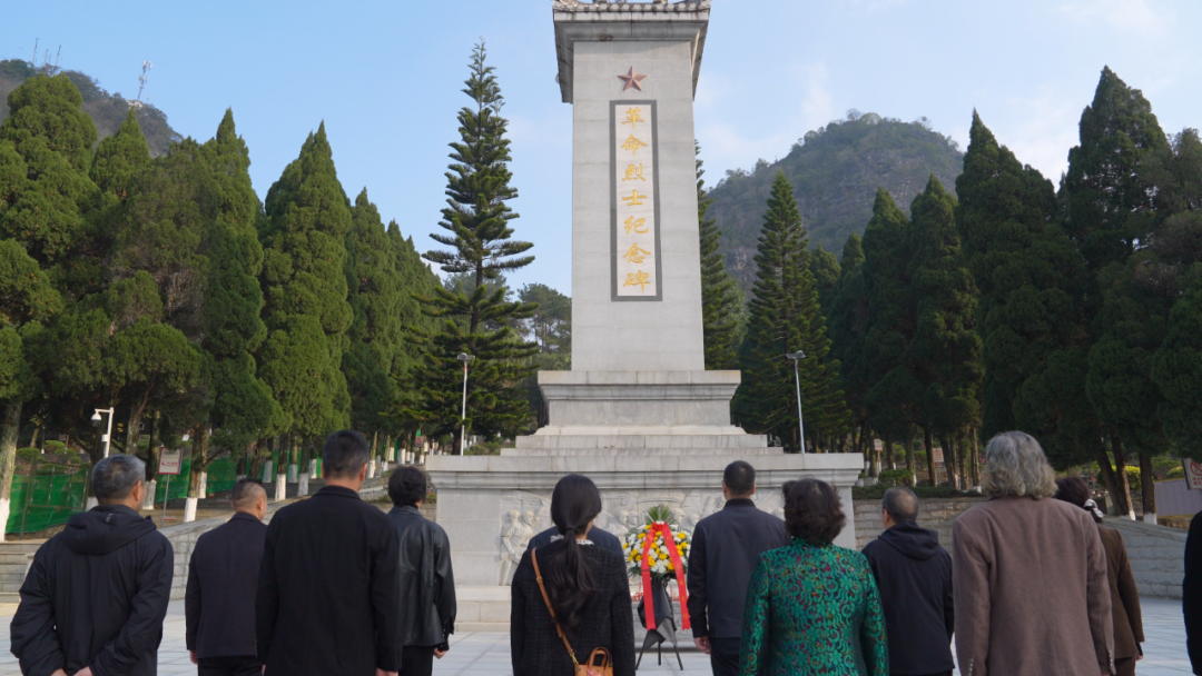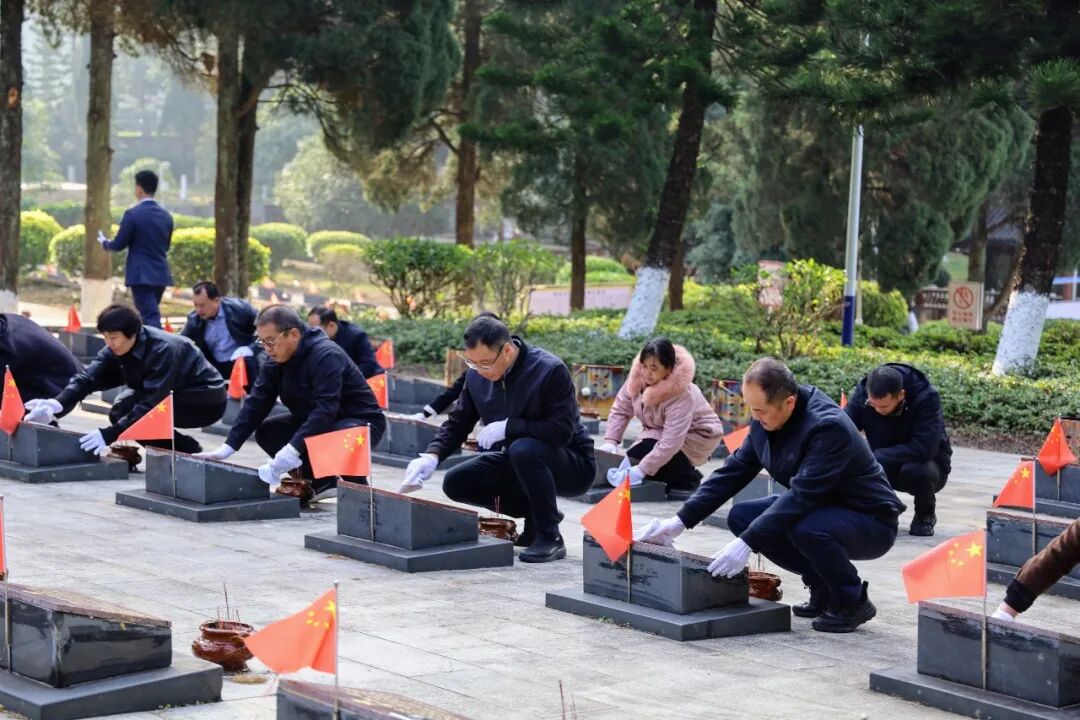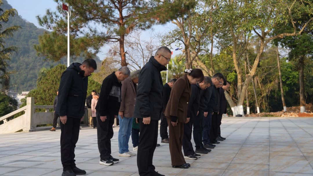 靖西市烈士陵园内庄严肃穆,全体人员列队肃立,向为中国人民解放事业和共和国建设事业英勇献身的烈士默哀致敬,随后依次敬献花篮、行三鞠躬礼、擦拭墓碑,深切缅怀先烈的牺牲奉献精神与崇高革命气节。