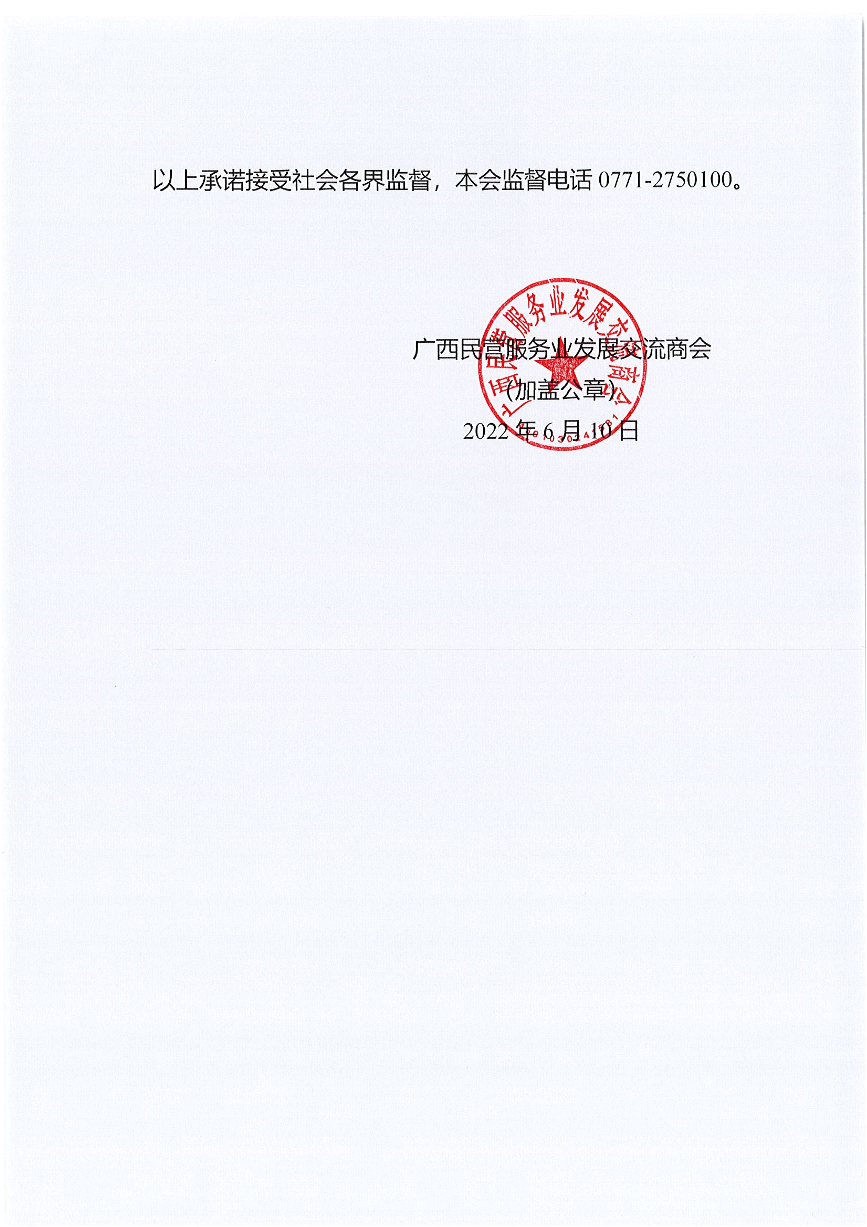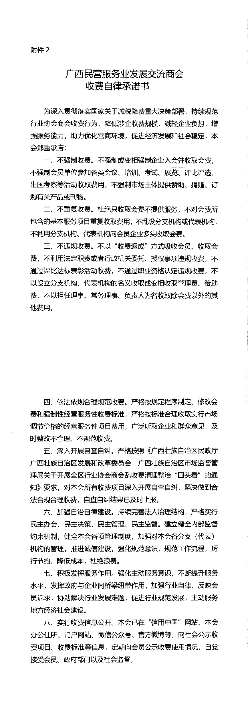 广西民营服务业发展交流商会收费自律承诺书