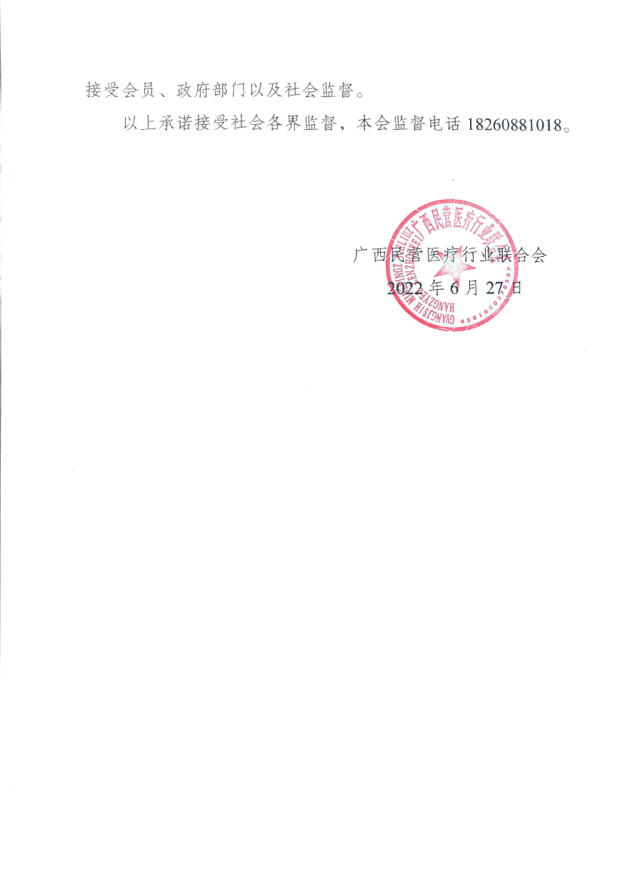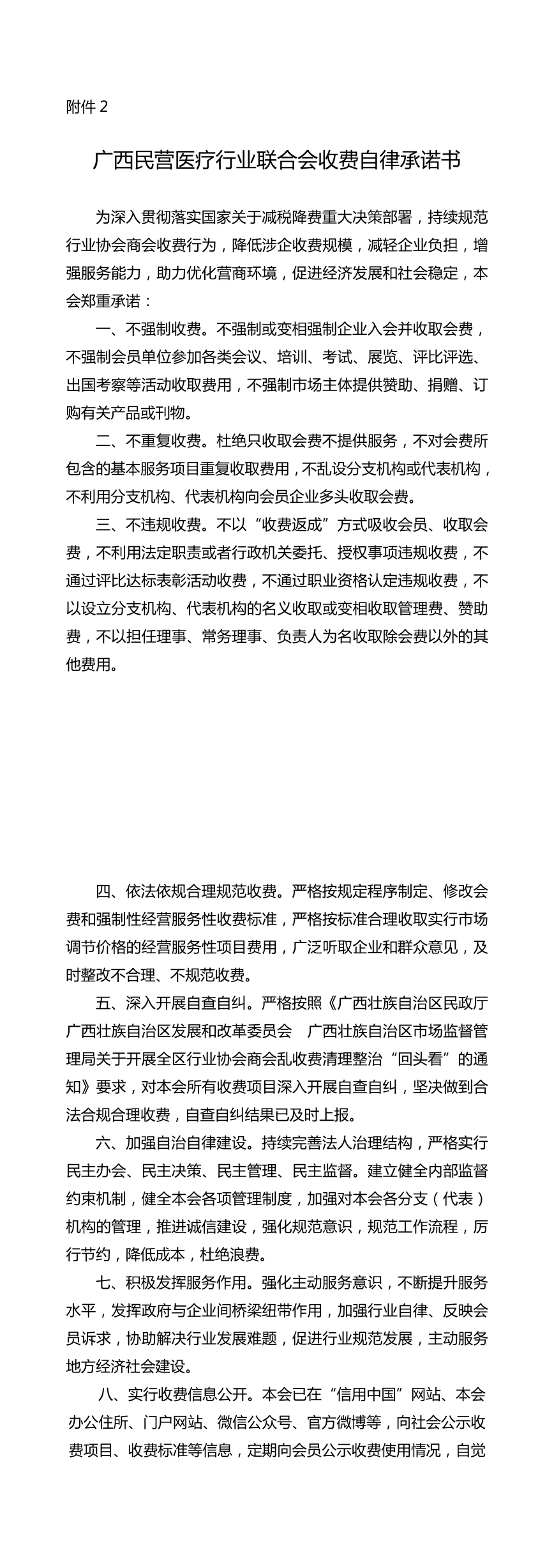 广西民营医疗行业联合会收费自律承诺书