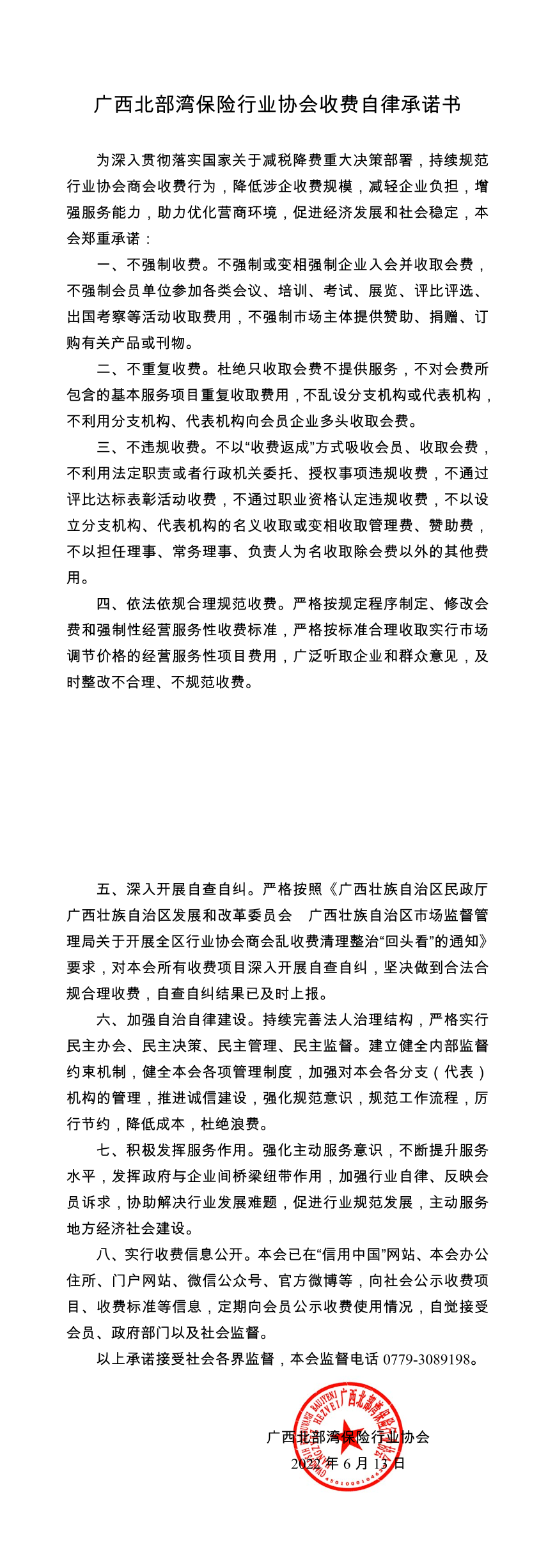 广西北部湾保险行业协会收费自律承诺书