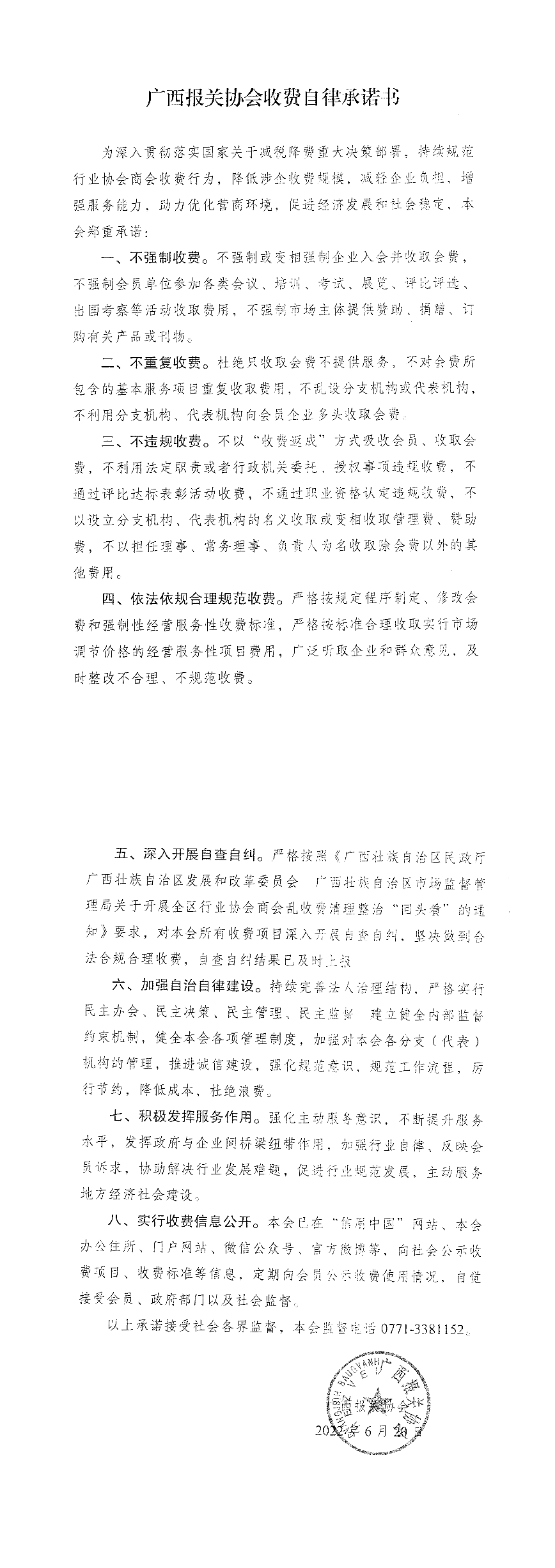 广西报关协会收费自律承诺书