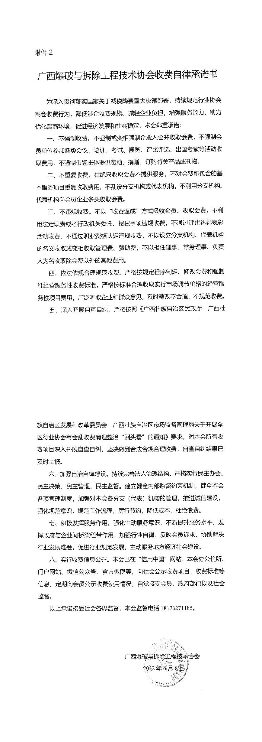 广西爆破与拆除工程技术协会收费自律承诺书
