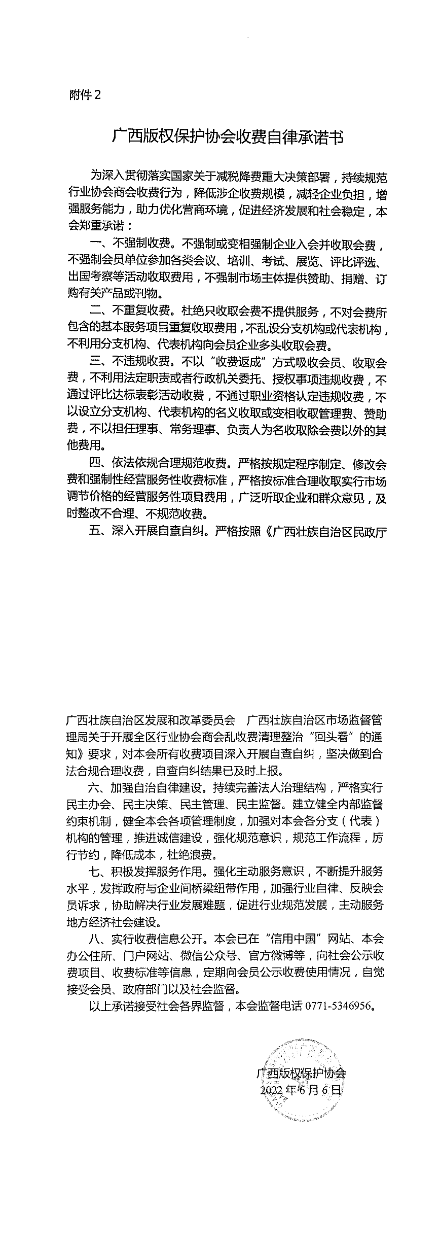 广西版权保护协会收费自律承诺书