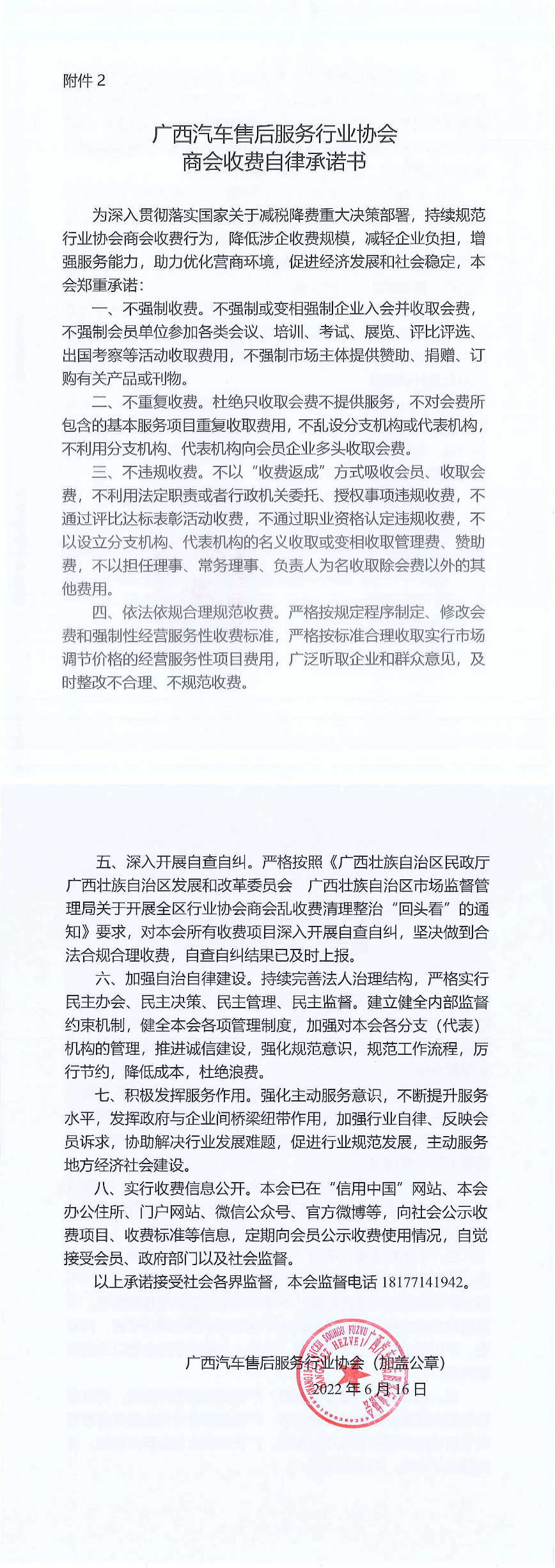 广西汽车旅游协会商会收费自律承诺书