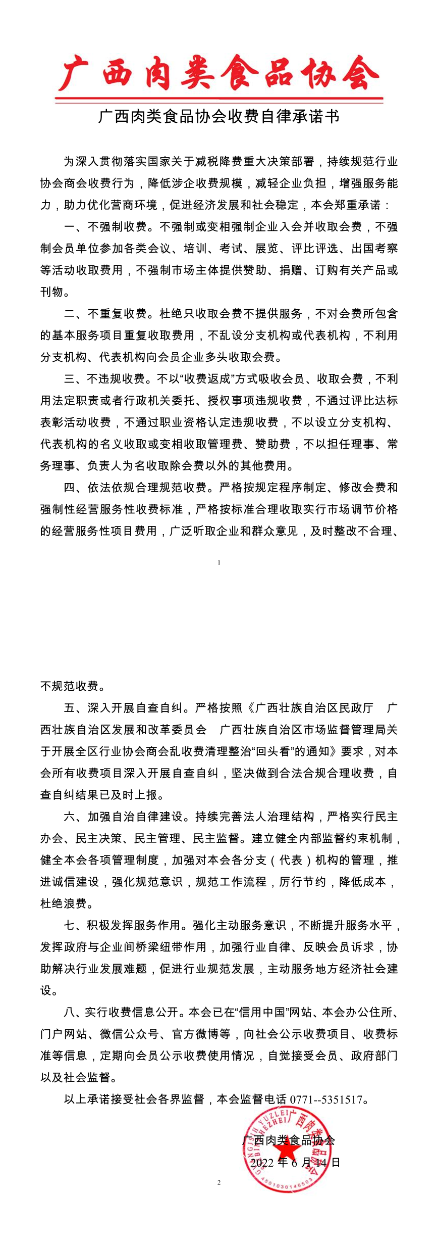 广西肉类食品协会收费自律承诺书