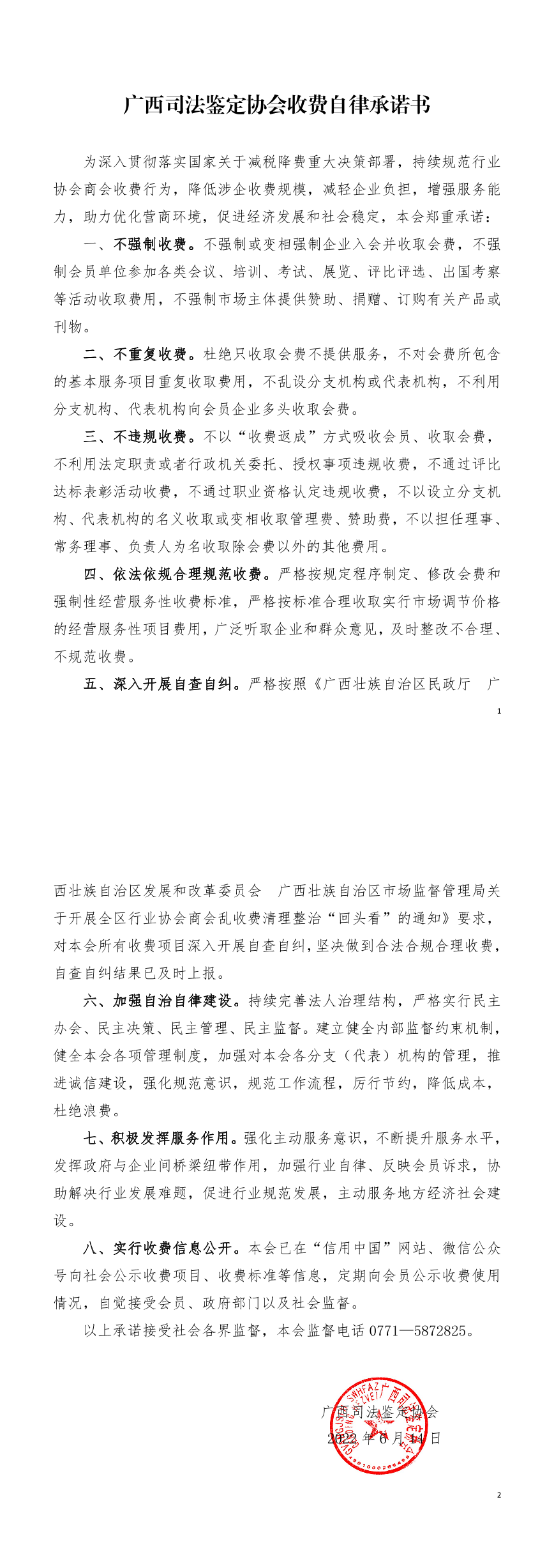 广西司法鉴定协会收费自律承诺书