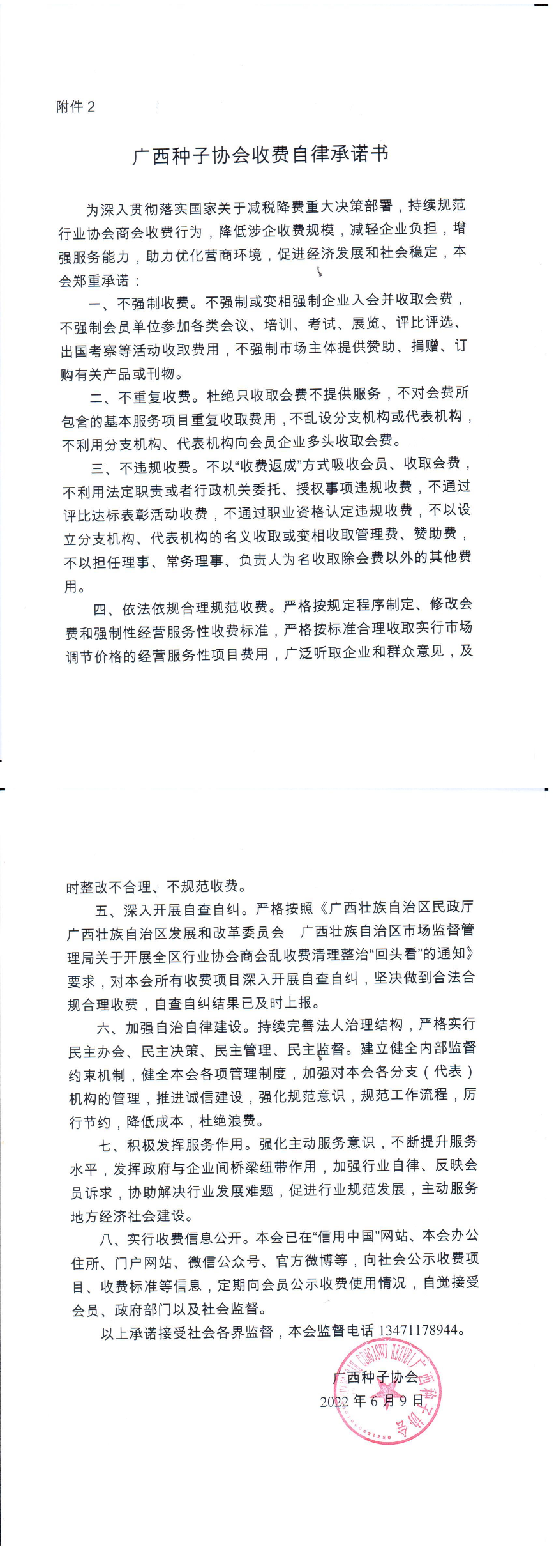 广西种子协会收费自律承诺书