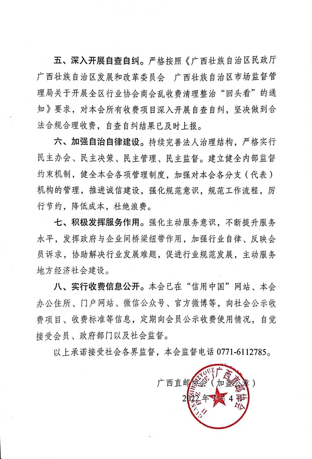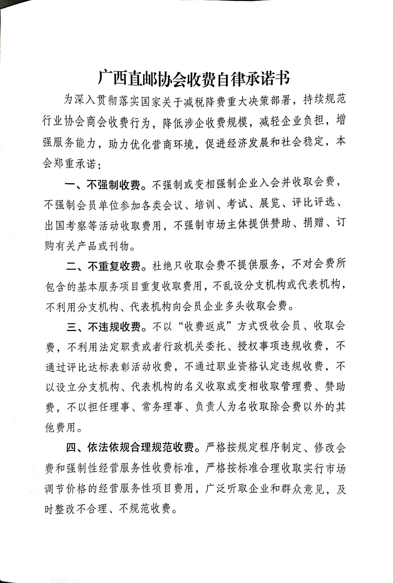 广西直邮协会收费自律承诺书