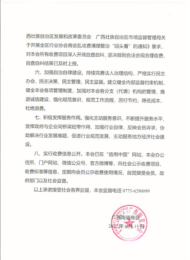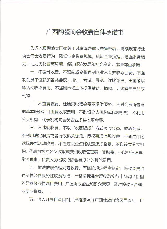 广西陶瓷商会收费自律承诺书