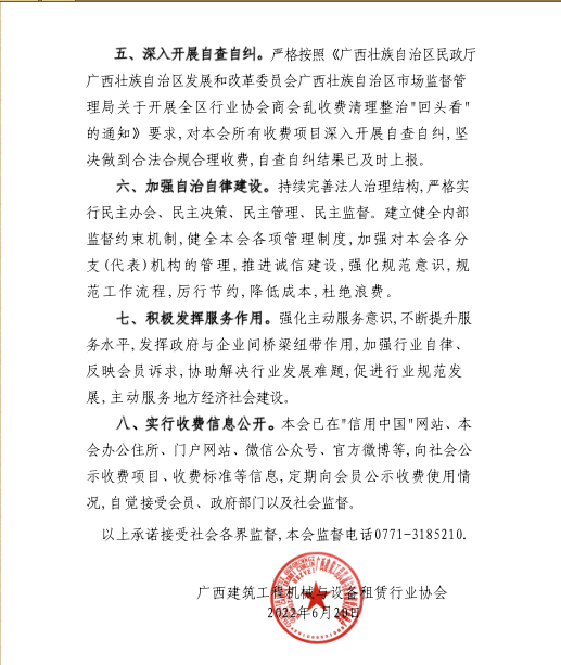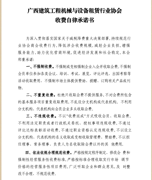 广西建筑工程机械与设备租赁行业协会收费自律承诺书