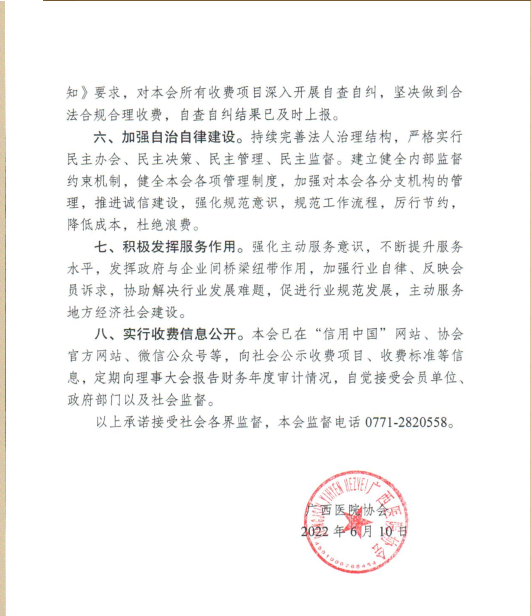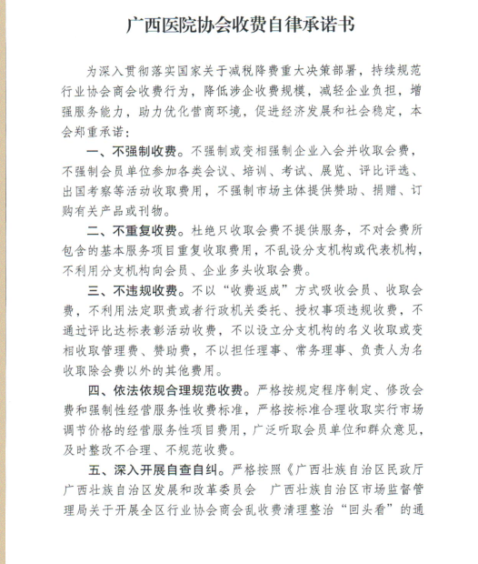 广西医院协会收费自律承诺书